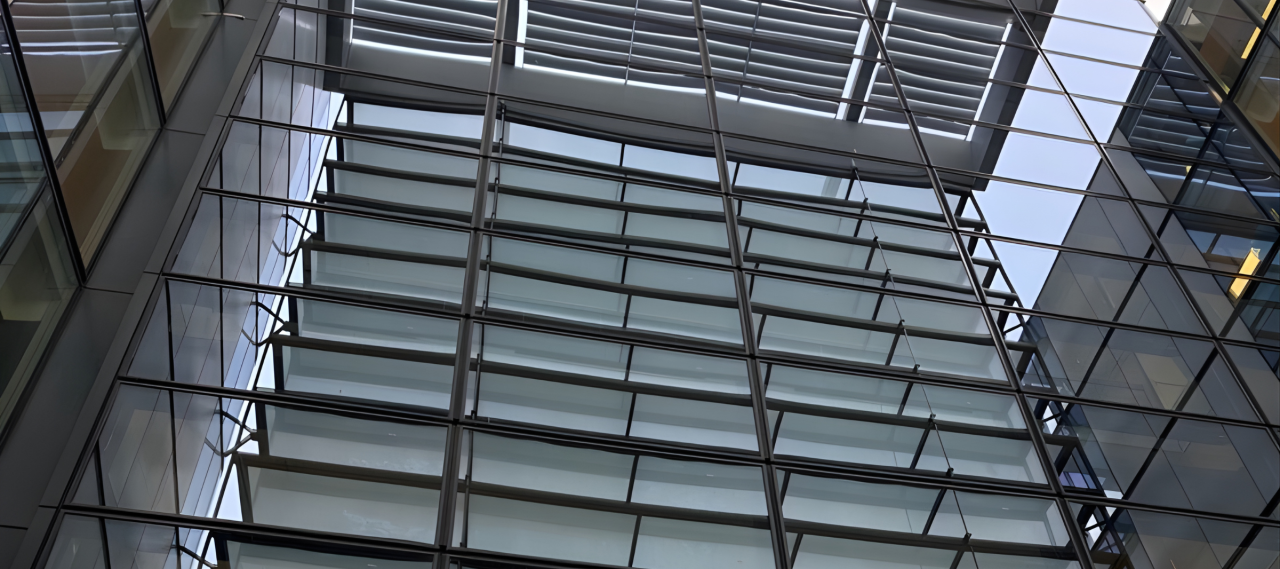La façade de la rue couverte est une façade grille en aluminium posée sur une charpente métallique. L’ensemble des panneaux vitrés constitue de grands ouvrants d’environ 1,8 × 3,00 m. Les ouvrants d’origine présentaient un sous-dimensionnement mécanique ainsi que des tolérances incompatibles avec les masses des vitrages. La solution développée a consisté en la fabrication et la mise en œuvre de nouveaux cadres à rupture thermique intégrant des renforts en acier et des vitrages isolants, associés à une cinématique abattante ouvrant vers l’extérieur, motorisée par des boîtiers à chaîne synchronisés. L’angle d’ouverture a été calibré afin de satisfaire aux exigences réglementaires de désenfumage et de ventilation naturelle, tandis que les cadres et les vitrages garantissent le comportement mécanique, les performances thermiques et l’étanchéité globale de la façade.