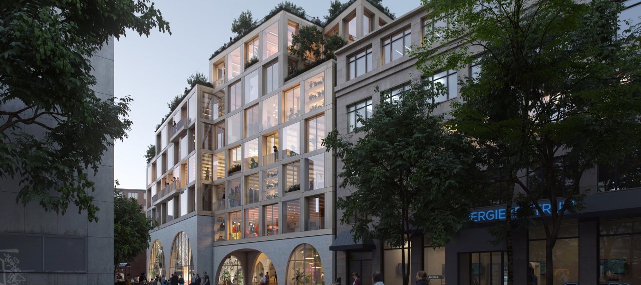 The existing rotation hall was designed as a reinforced concrete building in 1984. The redesign of the space programme places new demands on the existing load-bearing structure. The new "Kiel-Höfe" forms a perimeter block development that varies in size and shape. The upper floors' ceilings are made of timber-concrete composite construction. The entire first floor is planned as an open space spanned by an exposed concrete space frame. The arcades essentially form a podium for the hybrid timber building above.