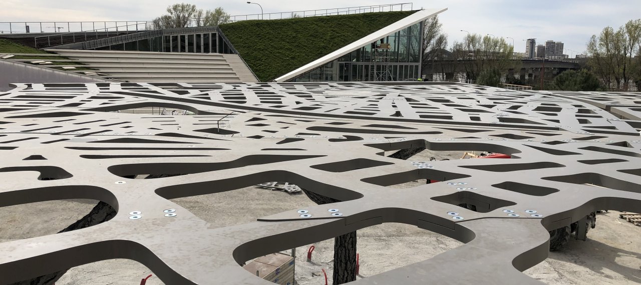 Wir haben die Teams von Leandro Erlich Studio für den Fonds Cré'Atlantique bei der Tragwerksplanung, der parametrischen Optimierung der Tragwerke und der notwendigen Umsetzung des Plans für das Baumdach unterstützt.