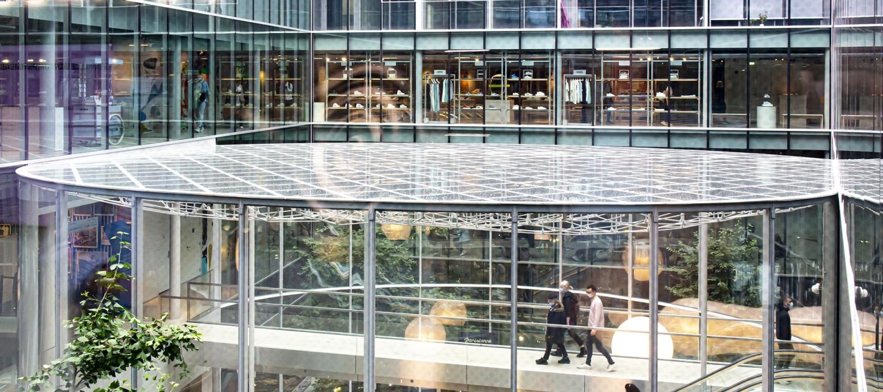 The Ombrelle is a glazed pavilion located on the patio of the Rivoli building, consisting of a flat roof and two double-height curved glazed facades. The roof comprises two steel sheets linked by rods: a recessed grid and a network of tie rods. The structure rests via articulated supports on the uprights of the curved façades and four posts inside the sheet.