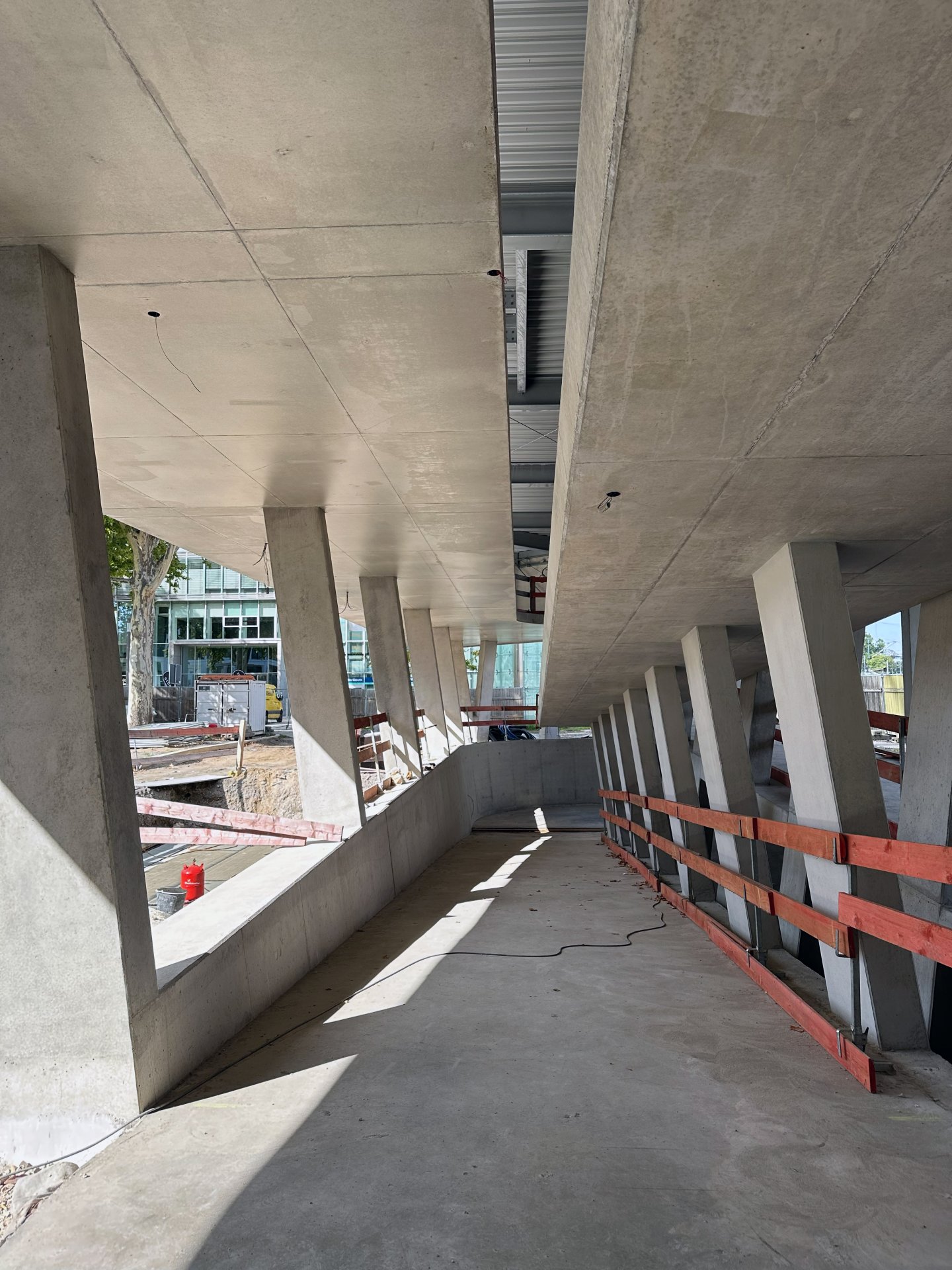 The new building forms the end of the square to the road and is supplemented by flanking noise barriers. The connecting structure is located to the south of the main railway station and connects the square to the main railway station via the existing subway. The two-storey building has a bicycle car park on the upper floor, commercial space on the ground floor and a basement. The building is accessed via an exposed concrete ramp, stairs and lifts.