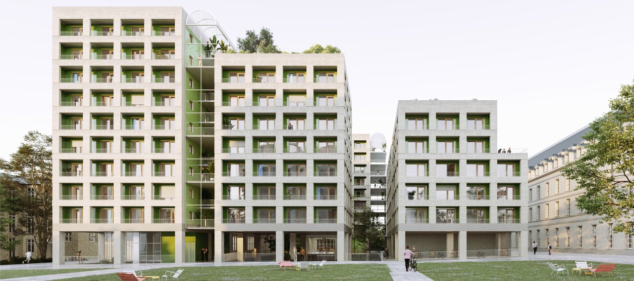 The construction principles of Parisian housing are reinterpreted here by combining 30 cm thick self-supporting dressed stone façades over nine storeys with a reinforced concrete beam-and-column structure and CLT floor slabs.