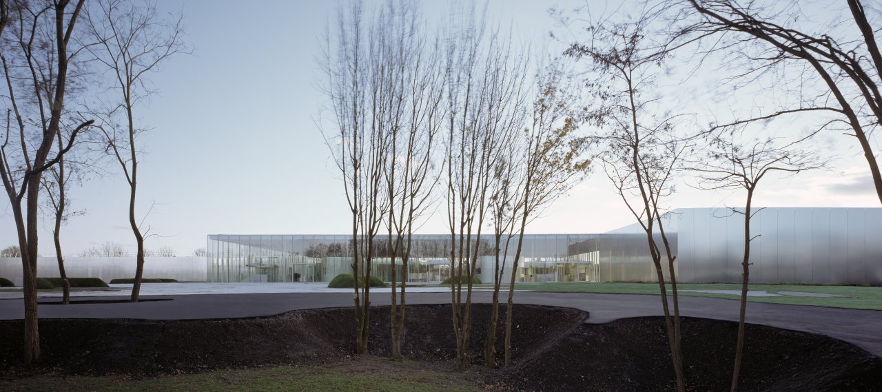 The buildings are cladded with polished aluminium sheet panels, allowing the surrounding landscape to be diffusely mirrored on the surfaces. Light ceilings lead natural daylight into the exhibition halls. At the centre of the complex, a hall with completely transparent façades houses the museum's main lobby.