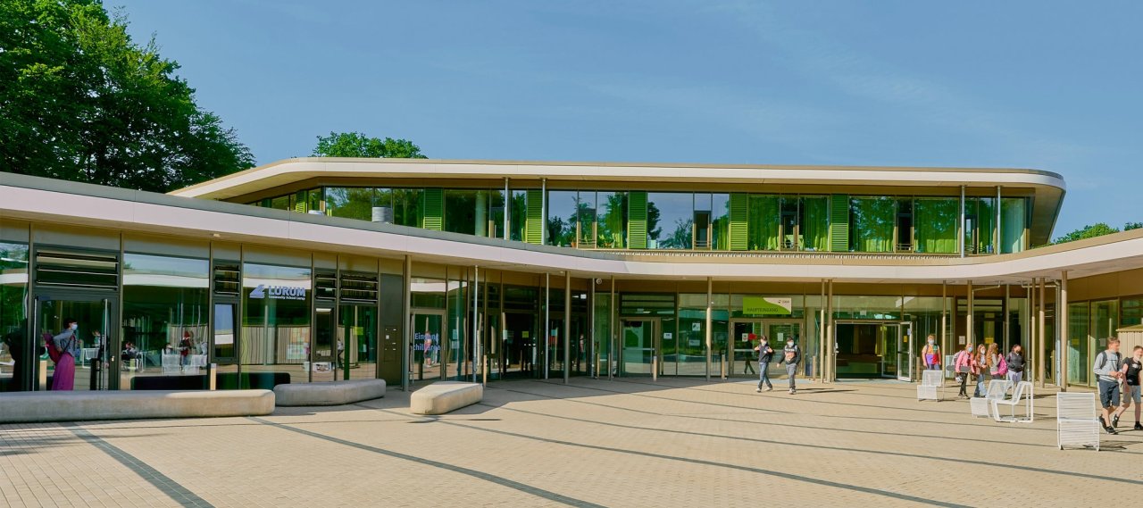 In addition to classrooms, staff, and administrative offices, the new building includes a daycare centre and a neighbourhood café. The school's approximately 1,000 students also have access to a multimedia centre. The new building includes a double and single sports hall, some of which is underground and directly connected to the main school building. All rooms are accessed via a central daylight-flooded atrium.