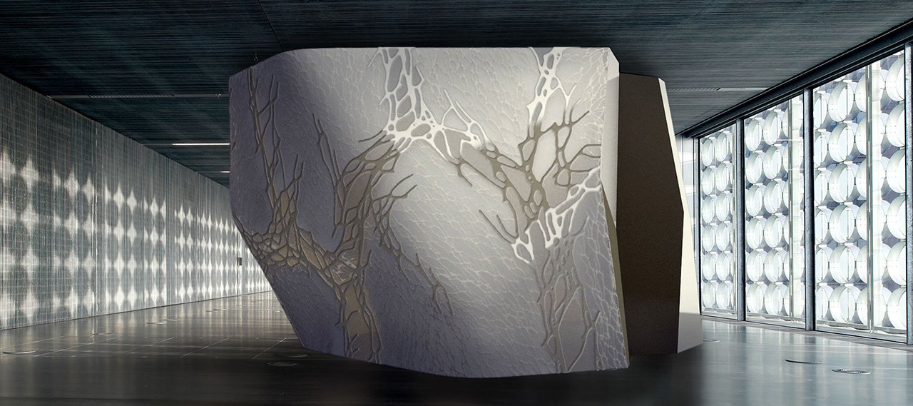 The pavilion’s structural logic derives from the logic of force flows in the shell components. The fibrous inlays are forming the structural network to reduce the deflection and the pavilion's self-weight. The pavilion was assembled out of several prefabricated panels. Those panels are laser-cut on flat sheets. The double curved surface re-forms when assembled and is put under pressure. The resin infusion bonds the skeleton and surface into one assembly which requires no form work.