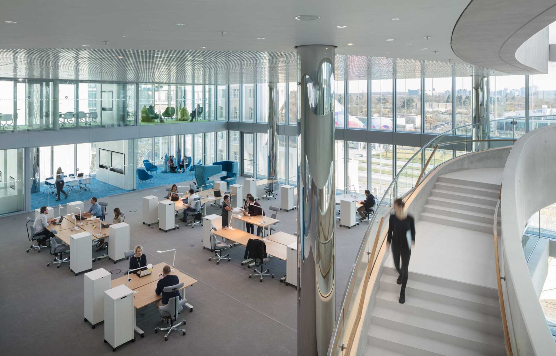 The three-storey employee restaurant has a footprint of 40m x 52m with a 10m x 10m column grid. The floor structure consists of reinforced concrete flat slabs with integrated hollow blocks. A self-supporting triangular spiral staircase is located in the atrium and spans over two floors.