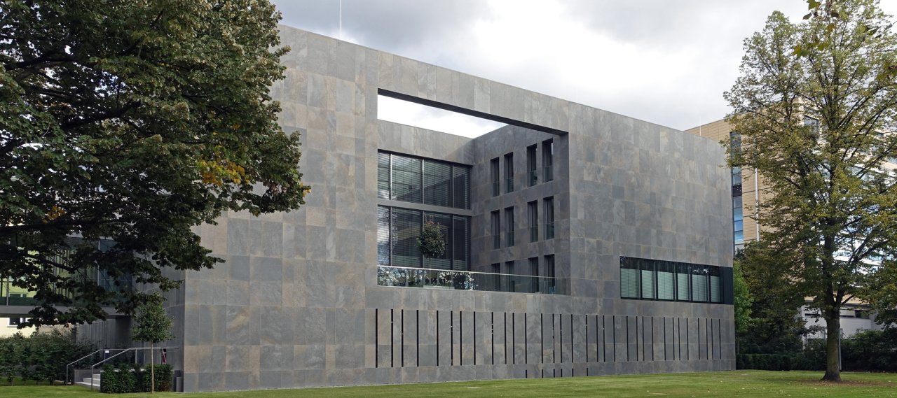 The Ministry of Finances now has a bigger library. In the centre of the extension, a four-storey large hall for events surrounds the U-shaped office spaces on the upper floors. It receives a large glass front as a "window to the city". A natural stone façade of brownish shell limestone and a glass roof complete the building into the form of a cube.
