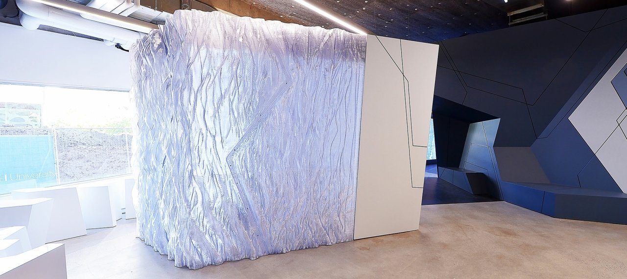SensiLab is a 500 m² research facility located at Monash University's Caulfield campus. The new open plan layout is structured by a series of single rooms. Those rooms function as meeting spaces and contain a variety of other functions such as sound studio and imaging studio. These objects are clad in a combination of 3D printed polymer and CNC cut enamel coated panels. SensiLab was designed as part of a larger redevelopment of Monash's Art Design and Architecture faculty and undertaken in collaboration with NMBW architecture Studio.