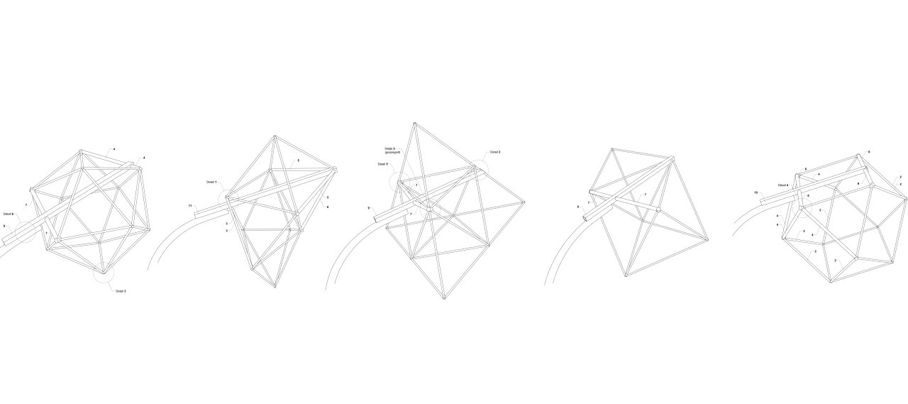 The proposed design includes the installation of five sculptures that will span the entire length of the ‘art mile', enhancing the area's quality and experience. It is also possible to extend this concept to the east, as far as Hubertusstraße, once the renaturalization of the Hellbach stream by the Emschergenossenschaft has been completed. The lampshades of the lanterns have been designed in a playful and sculptural form, looking both functional and reminiscent of technical drawings, architectural models by Richard Buckminster Fuller, or representations of molecular structures. The lampshade segments are open at the bottom, providing 'homes' for mosquitoes and insects during the relevant season.