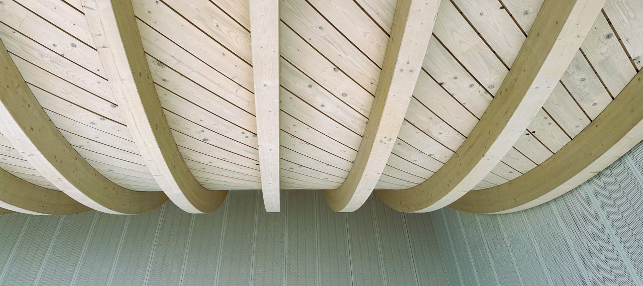 The shed-like roof consists of four modules of equal size that follow the edges of the building, forming double-curved surfaces. This allows daylight to enter the hall through both the roof structure and the lowest level of the façade. The technical solution to achieve the desired roof shape involved developing an anticlastic surface consisting of chain arch girders with the same curvature but different lengths, which are stretched between the wooden trusses. The girders are also reinforced by two crossed layers of wooden slats, creating a shell-like load-bearing behaviour and activating the diaphragm effect of the roof. The wooden trusses spanning across the hall form frame structures with the façade supports, which stiffen the hall in the transverse direction. In the longitudinal direction, stiffening is provided by diagonal beams arranged in the side façades.
