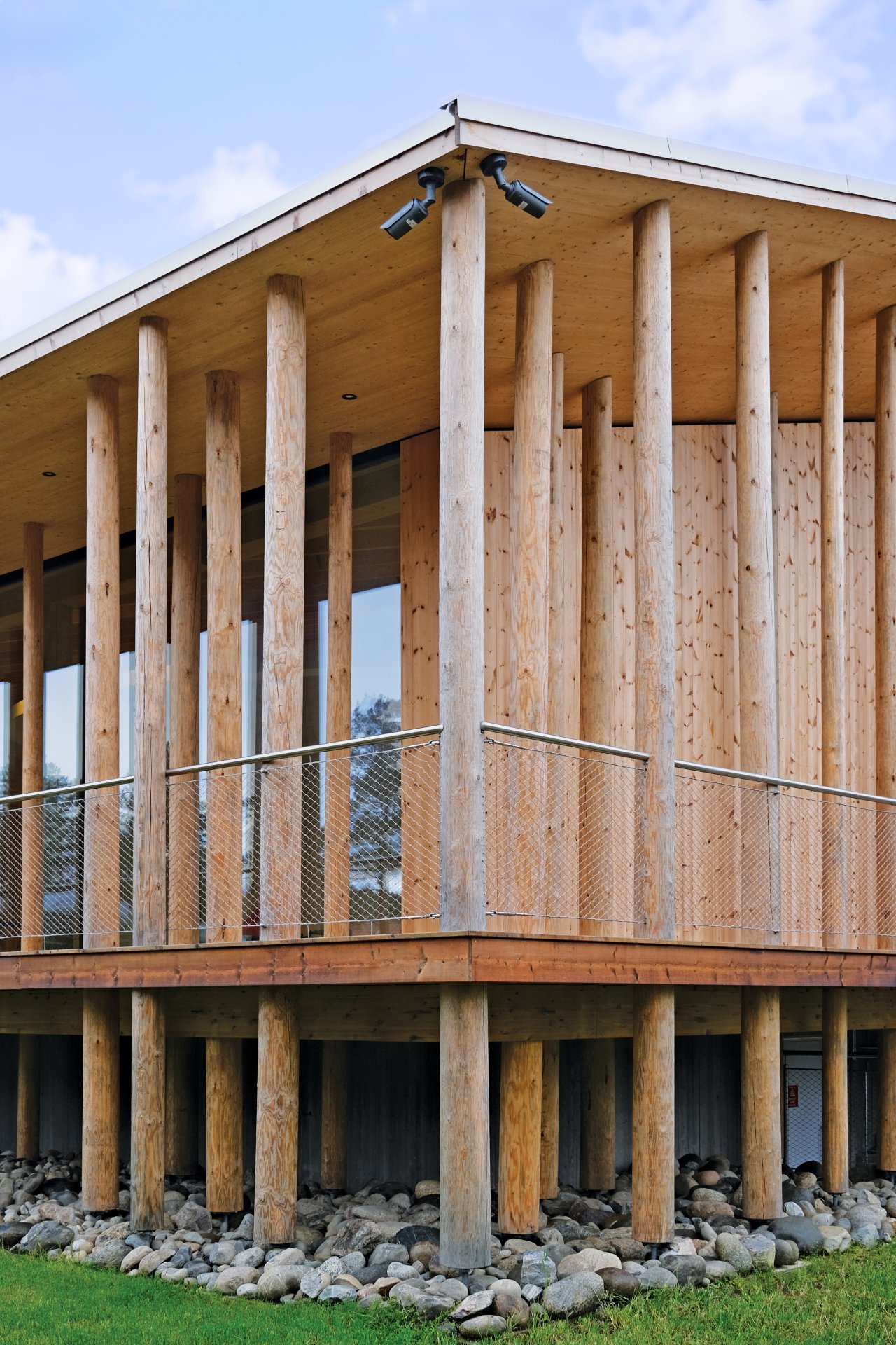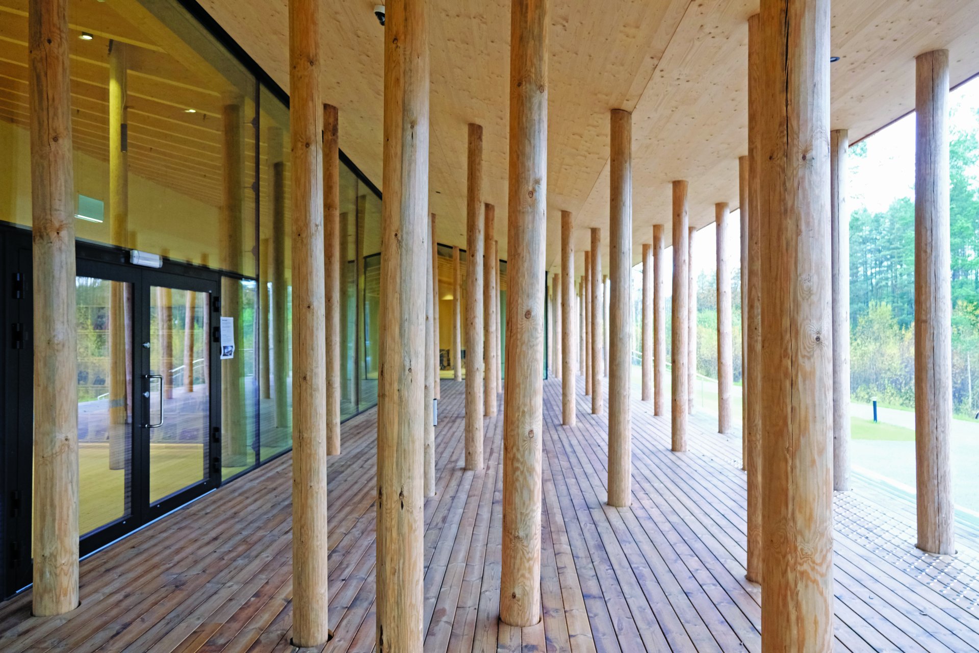 The building consists of three floors; a basement in cast in-situ concrete, the main floor on the ground and a mezzanine for technical rooms and storage. The structure is founded with foundations directly on ground. The building has approximately 350 columns made of whole tree trunks, placed both indoors and outdoors. The roof is made of massive wood, supported by glulam timber beams, which in turn are supported by wooden columns in the façade. Bracing walls are made of massive timber.