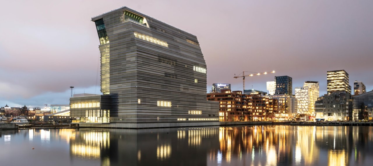 The new Munch Museum in Oslo houses 26,300 m² of exhibition halls, event rooms, depots, and office spaces. The first three floors include a lobby, shop, café, workshop, and library, while the top two floors offer views from the museum's restaurant and sky bar.