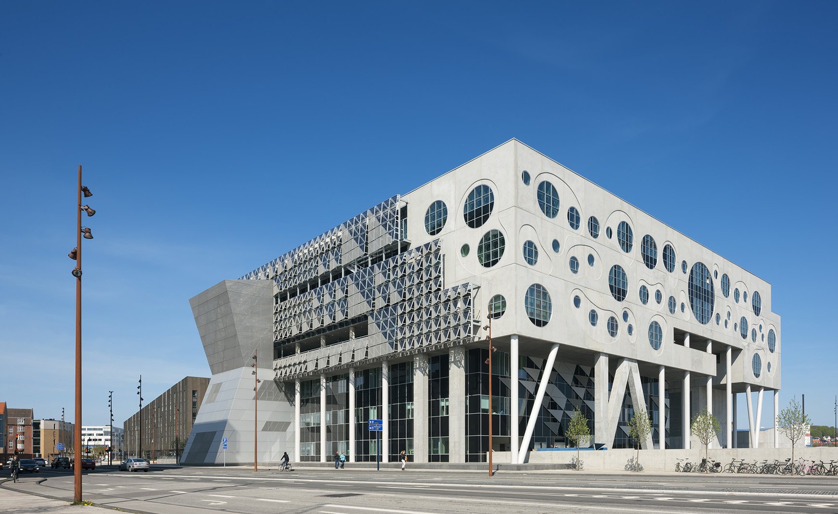 The centre of the complex is a music hall with 1,200 seats, projecting 10 m over the shores of the Limfjord. A flowing shell of steel and glass contains the large "event lobby", connecting the city, the fjord and the on-site faculties. The faculties are located in two further buildings, also projecting in up to 7 m height, connected by a library spanning like a bridge between the buildings.