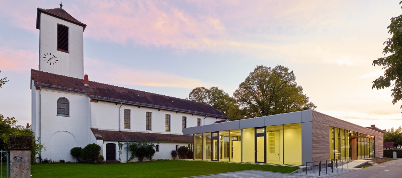 Analogous to the space-determining timber church ceiling, the new building is designed as a floating, spatially load-bearing structure opening up facing the churchyard and the community. The main defining element is the ceiling structure made of glulam beams that superimpose dynamically the hall and group rooms. To the south, the continuous glulam double-span beams form a cantilever creating a roof overhang for a spacious outdoor area.