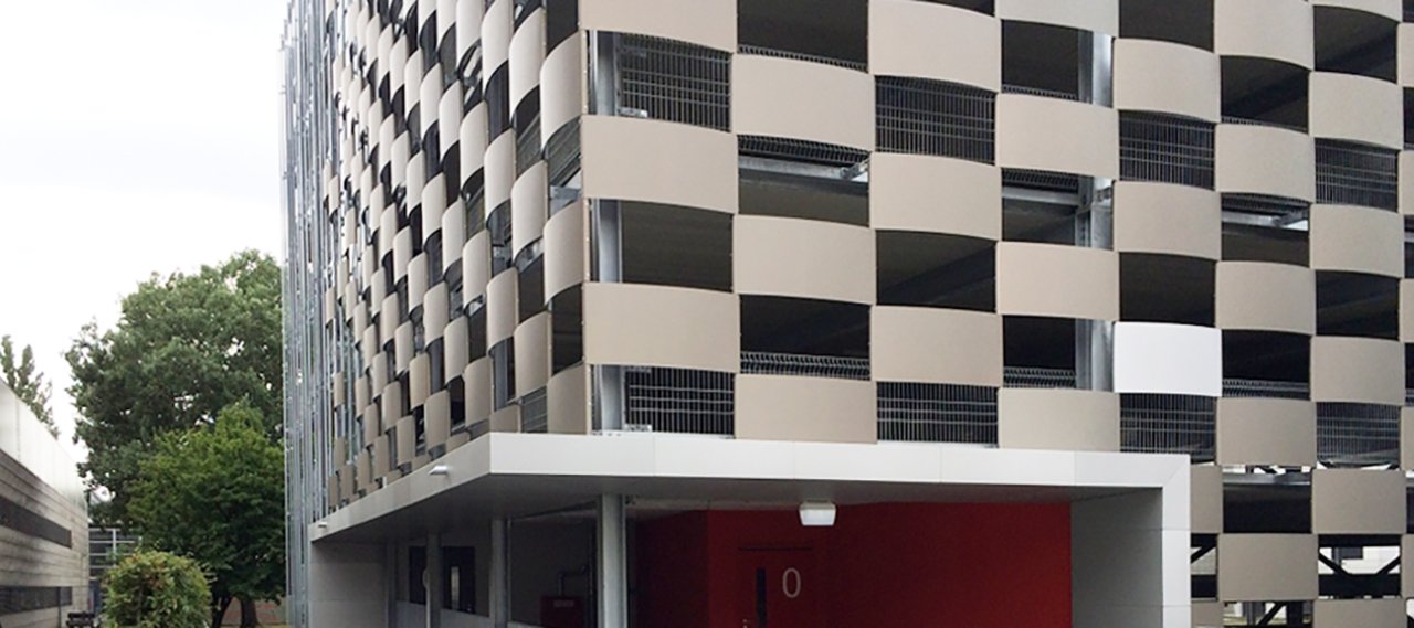 The parking garage’s metal façade consists of anodized and curved aluminum sheets arranged in a chequerboard pattern, which must span a distance of 1.25 m between vertical pipes made of steel. The façade is open, i.e. there are no requirements for impermeability, but high demands on the corrosion resistance. The intention was to use the smoothest possible elements without folded edges and to develop a design and installation principle as simple as possible. The canopies of the parking garage cantilever about 1.25 m and consist of a structural steel frame with an aluminum sheet cladding.