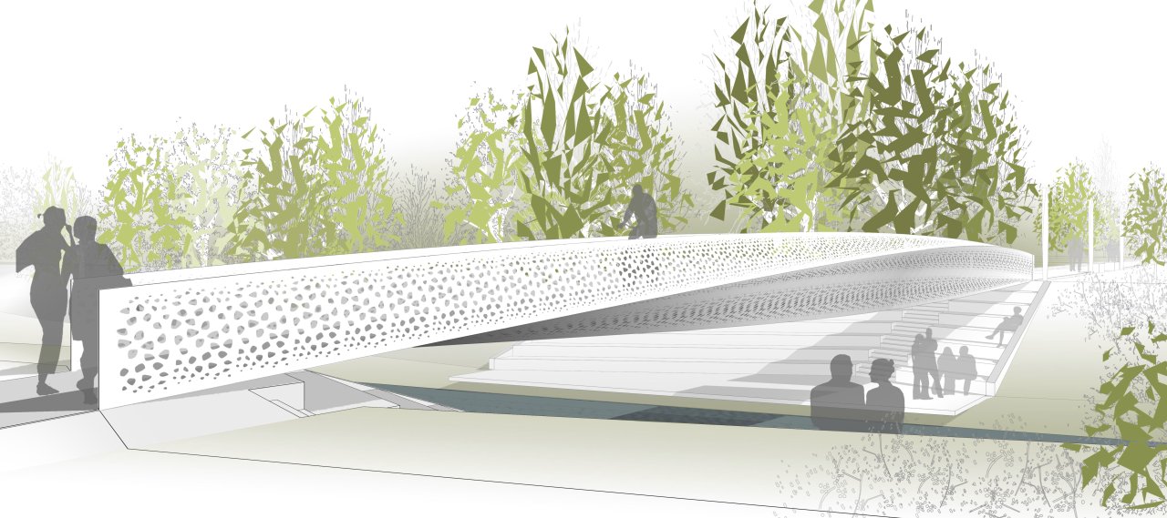 "The design proposes a bridge construction consisting of a box profile twisted by 90 degrees over the length of the bridge. A superior design quality is achieved almost playfully. The sole design element is an irregularly perforated steel sheet, its light finish radiating brightness and characterising the location as an art object. By the exceptional bottom view and side elevation resembling a bow, the bridge itself becomes an object of curiosity."