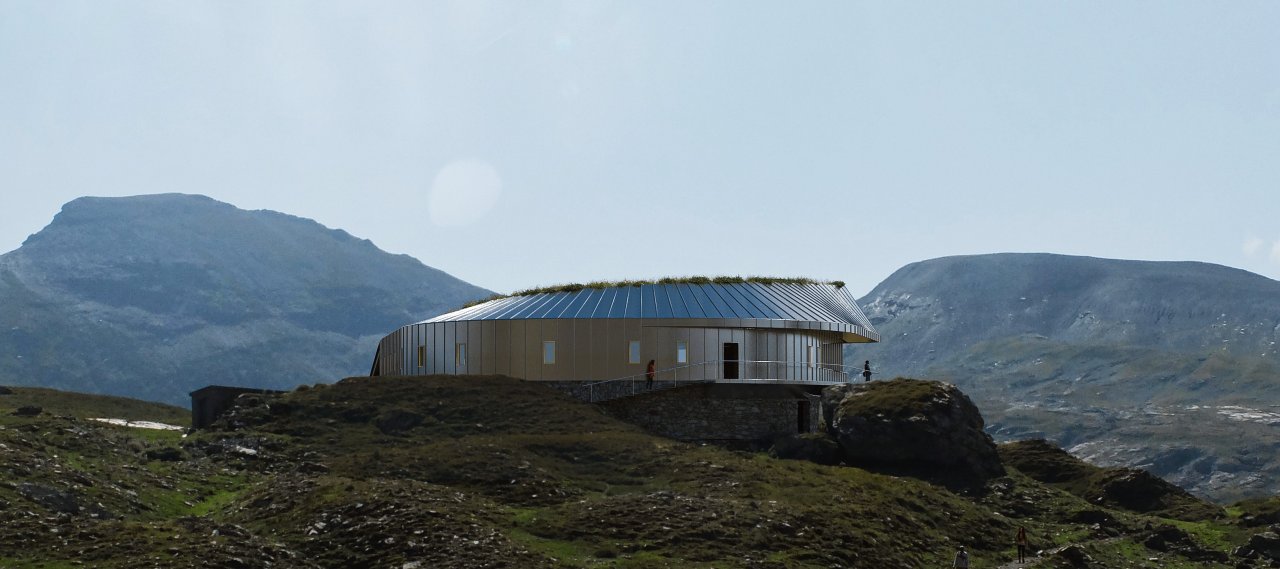 The service areas and winter shelter are located in the basement. The roof of the central spaces is planted to blend in with the landscape.