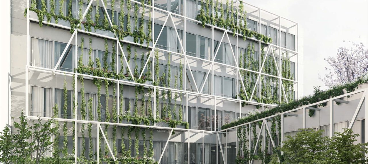 The vegetation is extended inside the plot on the southern façade and on the roofs of the courtyard to allow this space, located in the heart of a dense block, to breathe. To support this vegetal skin, a metal frame surrounds the building and draws a structural and graphic motif.