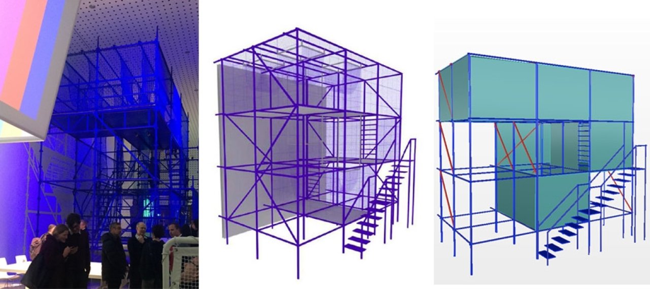 The structure is based on a regular standard scaffolding system that was adapted. The arrangement of the bracing elements and the floor elements was necessary in order to give the hammocks their functionality.