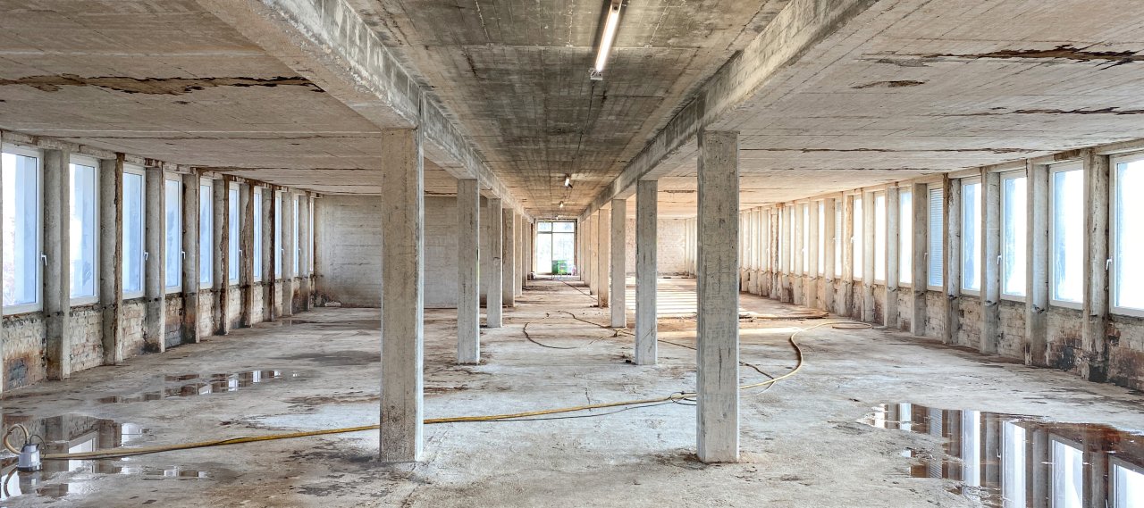 The existing structure will be refurbished, and the load-bearing structure of component 1 will be extended by four storeys. To achieve this, the flying roof, which was designed as a lined steel structure, will be dismantled, refurbished and then rebuilt in the original position of the roof. A two-storey underground car park will be built in the area of the former service yard. As part of the construction work, the existing lift system will be completely dismantled in order to install a new lift system with a firefighter lift.