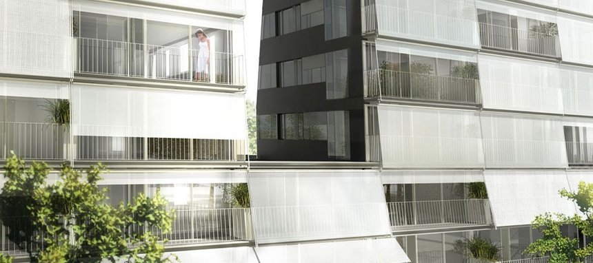 The architectural project consists in alligning the building along the Stendhal street and to conserve a long, linear inner court on the south, which forms the common heart of the three programs. Along the housing unities, a 6 m large open air connection is made between the inner court and the street.
