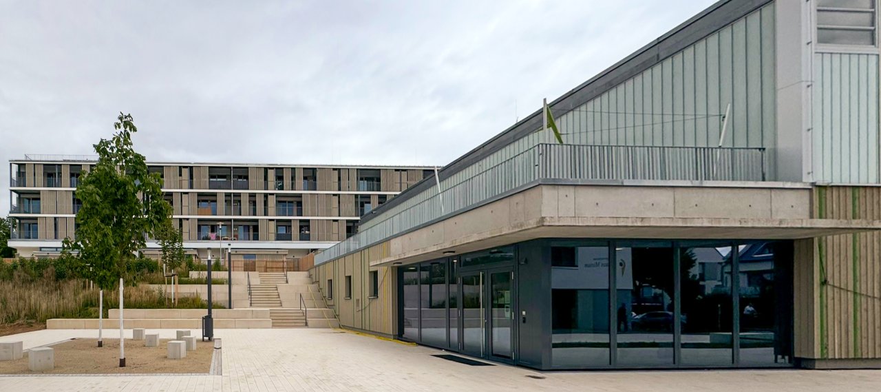 Das Bauvorhaben beinhaltet den Bau einer Kindertagesstätte mit vier Gruppen, darüber befinden sich drei Wohngeschosse mit 18 Wohneinheiten. Eine angrenzende Schulsport-Einfeldhalle ordnet sich im rechten Winkel zur Kindertagesstätte an; zusätzlichs wurde ein 90 m² großer Gymnastikraum errichtet. Die Tiefgarage ist sowohl für die Bewohner:innen als auch für die Mitarbeiter:innen der Kita zugänglich.