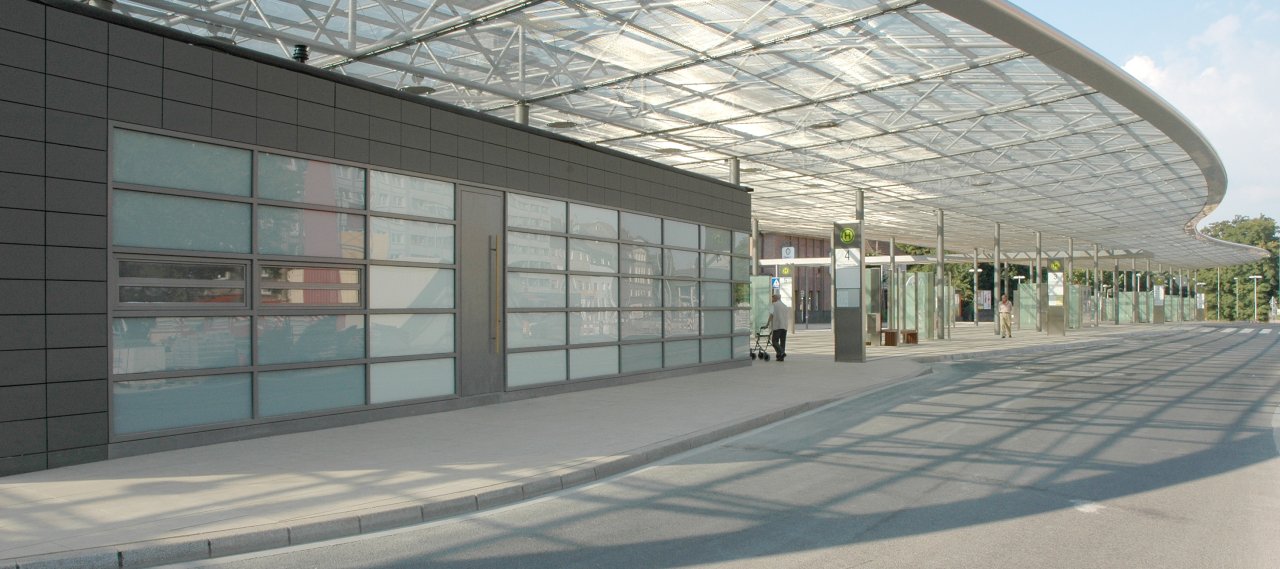 The station square of the central bus station in the city of Herne was covered with a new roof construction. The transparent, open-sided roof structure bears on a double-row of pillars and hovering 6 m above the ground. A secondary roof structure connects the bus stop to the central bus station and allows sheltered access to the building.