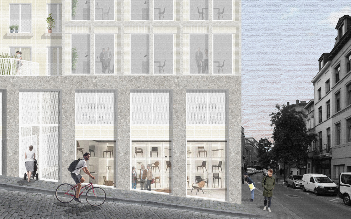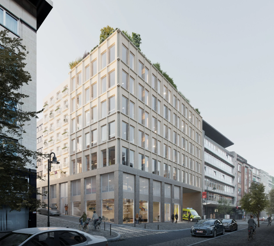 The new OCMW Brussels building is an 8-storey mixed-use project on the corner of Rue Haute and Rue de l’Abricotier, in the heart of the Marolles. Completing a block shaped by UMC Sint-Pieter and existing OCMW offices, it brings together offices, 14 social housing units, a retail space, a crèche for 20 children, and an emergency access passage.