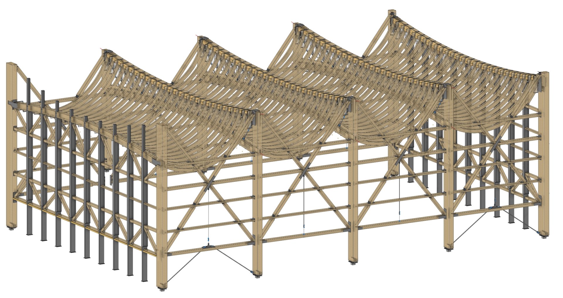 The shed-like roof consists of four modules of equal size that follow the edges of the building, forming double-curved surfaces. This allows daylight to enter the hall through both the roof structure and the lowest level of the façade. The technical solution to achieve the desired roof shape involved developing an anticlastic surface consisting of chain arch girders with the same curvature but different lengths, which are stretched between the wooden trusses. The girders are also reinforced by two crossed layers of wooden slats, creating a shell-like load-bearing behaviour and activating the diaphragm effect of the roof. The wooden trusses spanning across the hall form frame structures with the façade supports, which stiffen the hall in the transverse direction. In the longitudinal direction, stiffening is provided by diagonal beams arranged in the side façades.