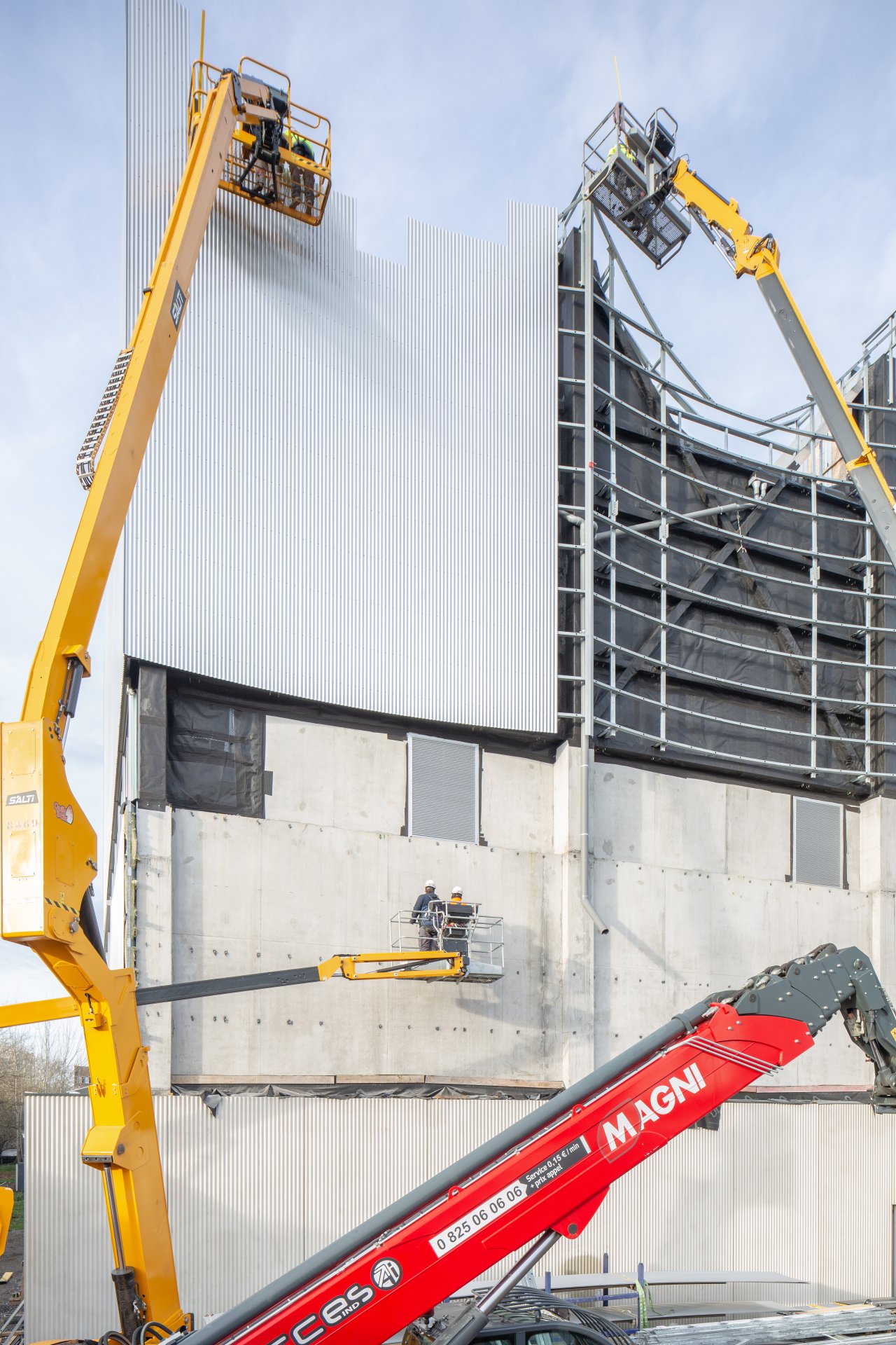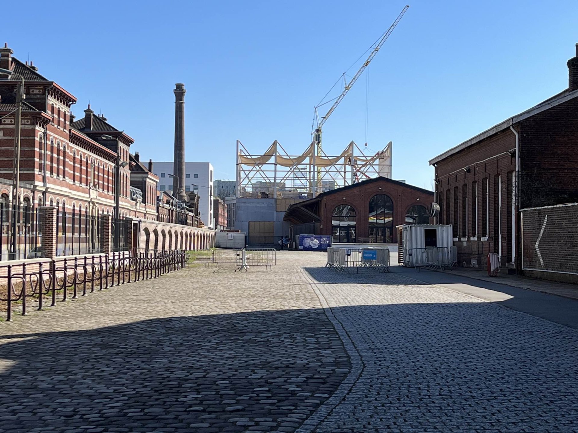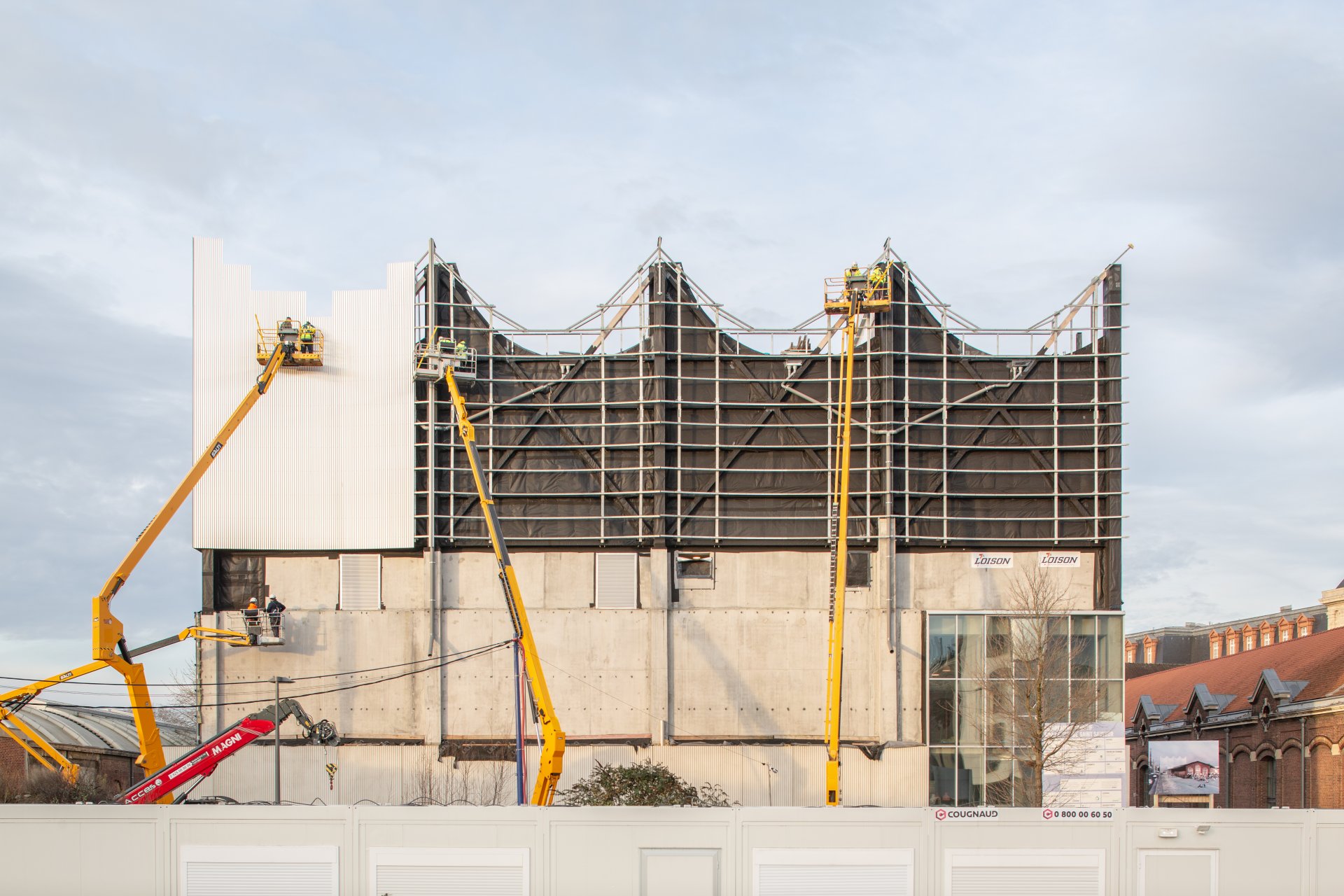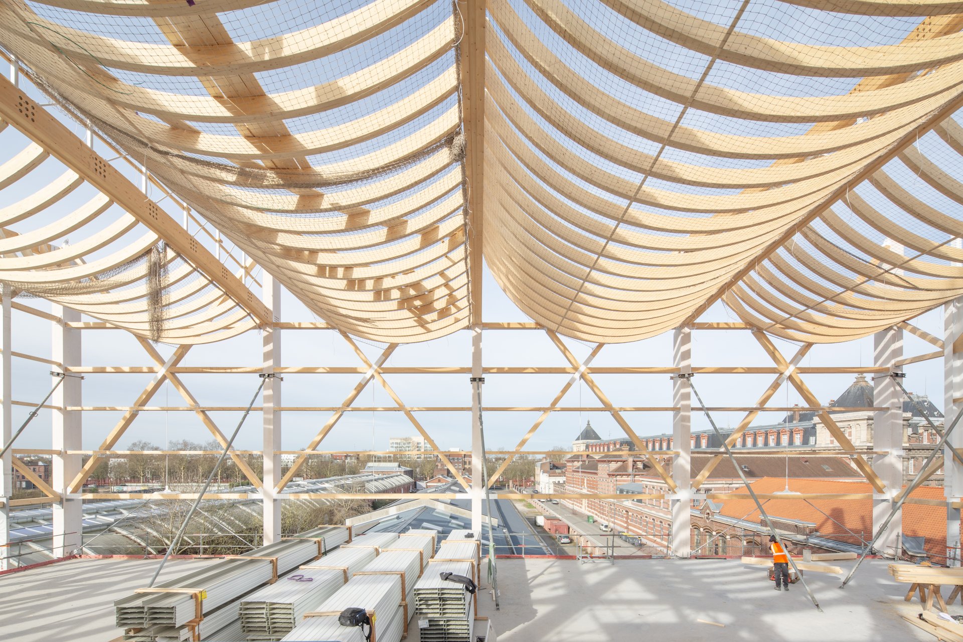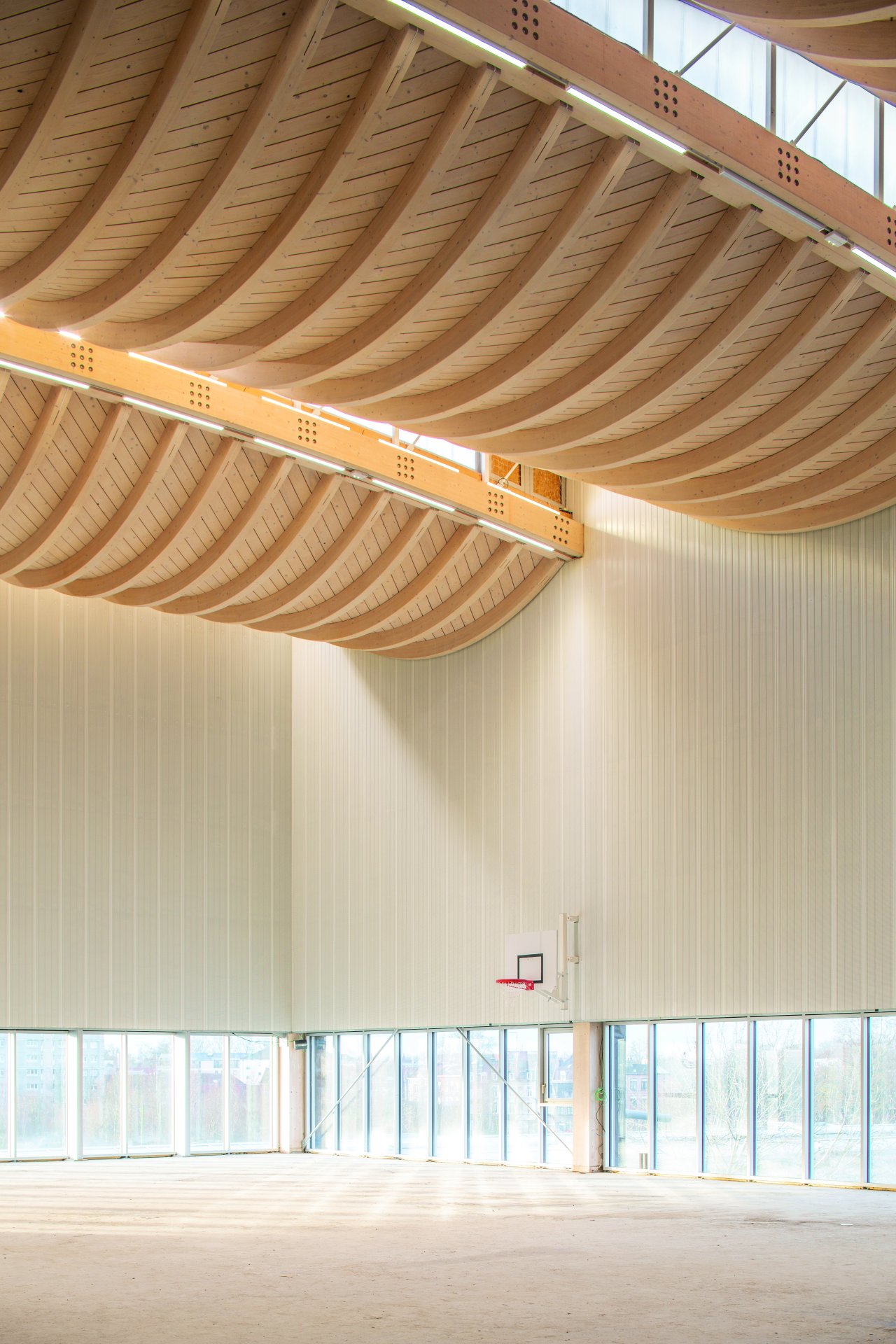 The new sports hall is located at the entrance to the new Saint-Sauveur district, directly behind the former Saint-So freight station. The three-storey new building consists of several sports halls stacked on top of each other and is constructed from prefabricated reinforced concrete. It is completely covered by a four-part arched wooden roof, which is supported by a steel and wood façade construction.