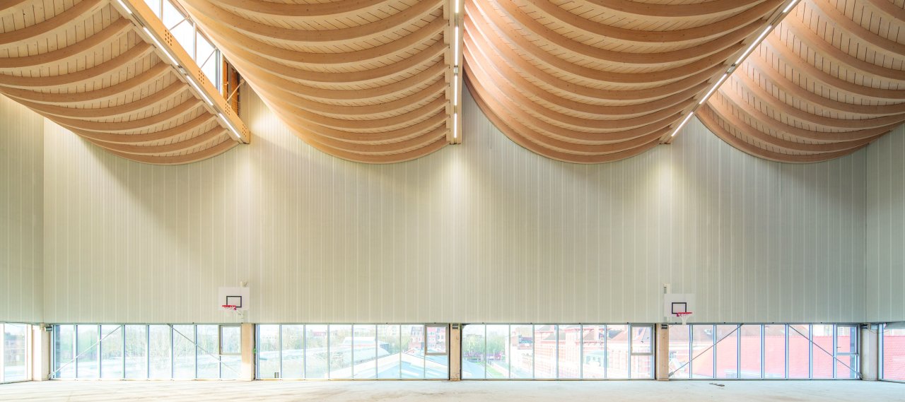 The new sports hall is located at the entrance to the new Saint-Sauveur district, directly behind the former Saint-So freight station. The three-storey new building consists of several sports halls stacked on top of each other and is constructed from prefabricated reinforced concrete. It is completely covered by a four-part arched wooden roof, which is supported by a steel and wood façade construction.
