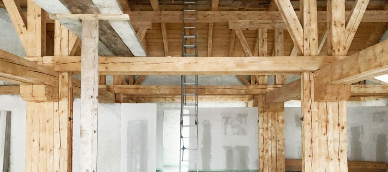 In the course of the conversion, a tram ceiling was removed, but the main beams and the ceiling joist construction were left. In order to maintain the shear stiffness of the existing planes, part of the ceiling joist and main beam system was infilled with diagonals. Due to the change of use with new floor superstructures, local reinforcement measures for the wooden structure were carried out. Nine generous openings in the exterior masonry were realized with rigid steel construction frames. These are designed to accommodate both vertical and horizontal loads from wind and earthquakes.
