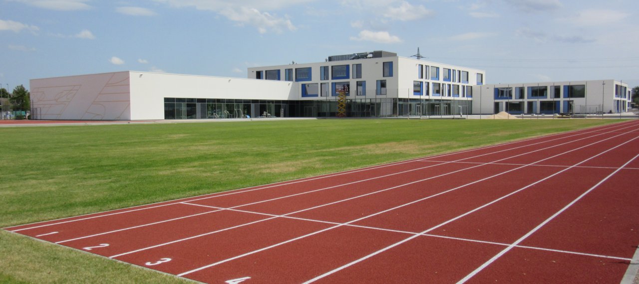 The project consists of a secondary school with gymnasium. The entire complex is divided into five reinforced concrete buildings. The gymnasium is located to the north, the three-storey main building in the centre and in the south there are three two-storey learning houses. Only the main building has a basement.