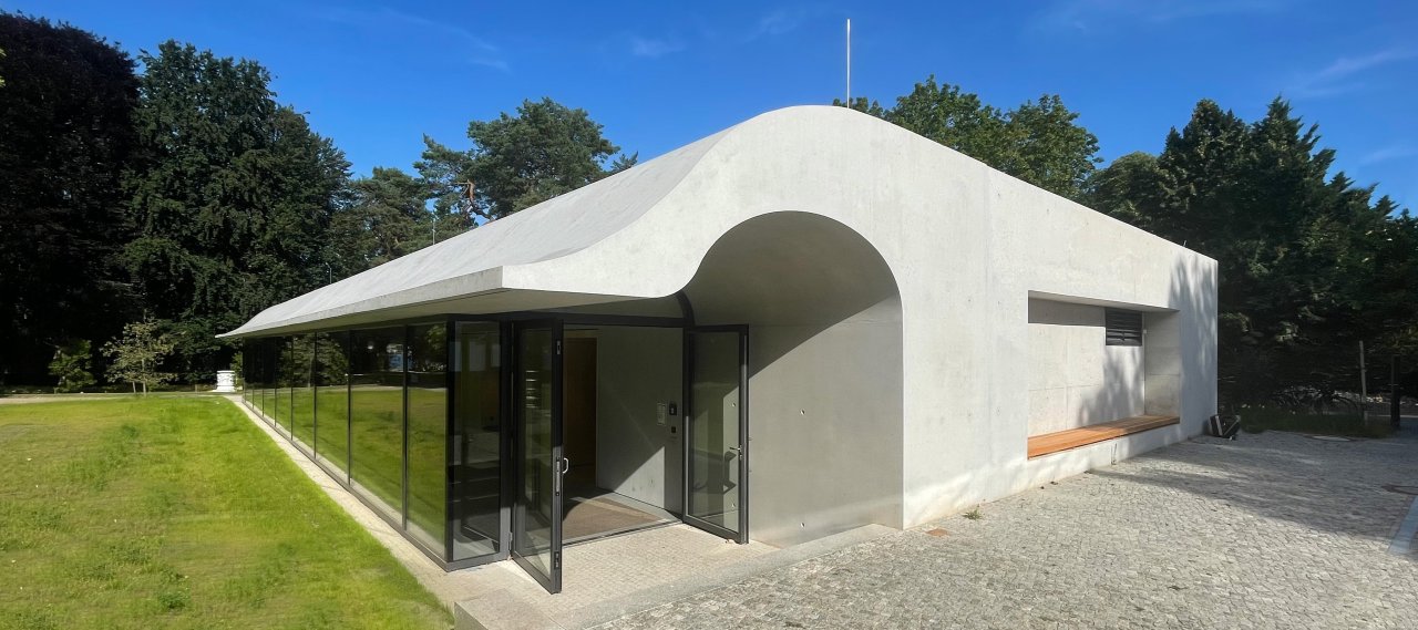 Das eingeschossige Gebäude besitzt einen rechteckigen Grundriss mit Seitenlängen von etwa 30 m auf 15 m und wird durch eine tragende Innenwand in einen Hauptinnenraum und den Eingangsbereich unterteilt. Die Gebäudehöhe beträgt 3,70 m. Überwiegend als Stahlbetonbau mit tragenden Wandelementen und Sichtbetonoberflächen ausgeführt, kragt nördlich das markante Vordach in Leichtbauweise über das Foyer hinaus. Das einschalige Dach besitzt neben der tragenden Funktion auch eine bauphysikalische Dämmebene.