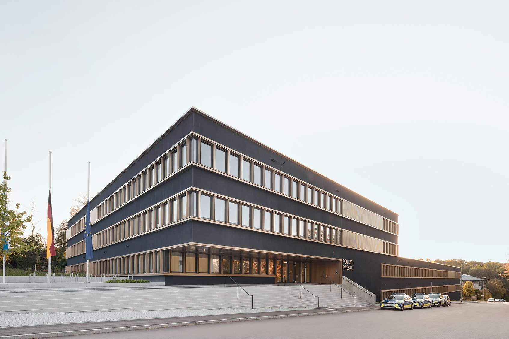 The new service building of the Bavarian State Police in Passau unites the offices previously distributed throughout the city into one building. The merger required a complex spatial program with high use demands, which were assessed during the initial project development. In addition to office spaces, the building includes various training rooms, a shooting range, evidence vaults, a detention cell area, and a car workshop.