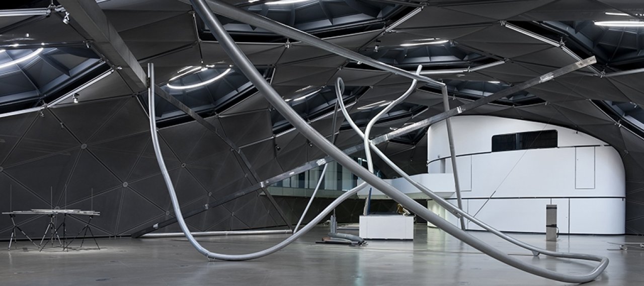 In his solo exhibition for the Space01 at the Kunsthaus Graz, Michael Kienzer has created a large-scale sculpture that stretches and misses the space. The sculpture goes beyond one’s understanding of physical formats and discloses relativity with respect to viewer perspectives. As in the story of Gulliver, the world is once small, then large, once expansive, and then comprehensible again. So it seems that the escalation of sculpture directly connects with the composure of the viewers and their environment.