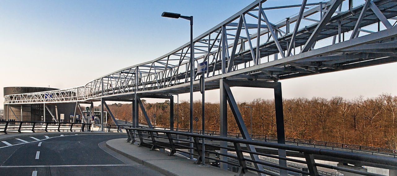 Le parking est relié au plus grand bâtiment de l‘aéroport Francfort „The Squaire“ par un pont en acier d‘environ 300 m de long. Celui-ci, parallèle au bâtiment, accueille un mini-métro qui transporte les clients au bâtiment de bureaux.