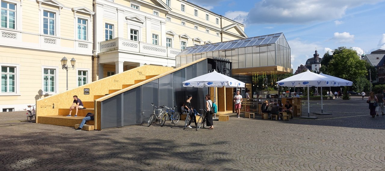 For the 70th anniversary of the Darmstadt summer schools, the host created a unique visual and spatial eye-catcher with the temporary SOUNDGARDEN in the centre of Darmstadt. The image of a vocal “greenhouse”, housing cacti which from afar remind of John Cage, serves as a visual basis for the sculpture. The pavilion consists of a timber frame construction covered with OSB boards. The stepped access to the upper level serves both as scene and seating area. At the upper level, a prefabricated greenhouse is supported by upstand beams cantilevering approx. 4.2 m.