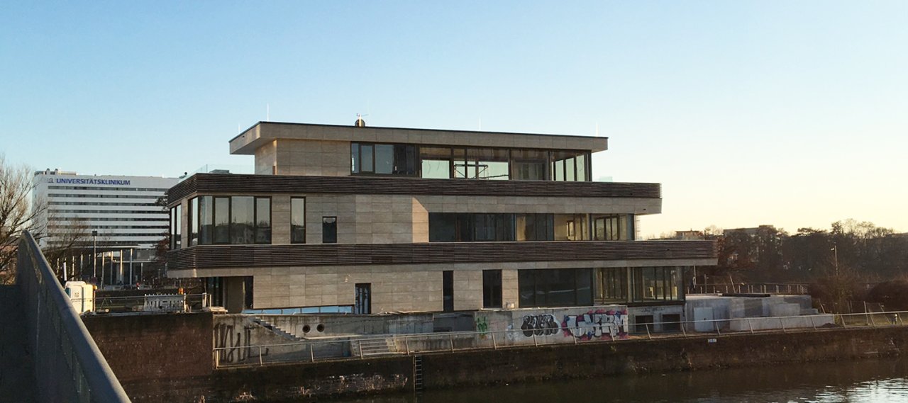 The „Spa Westhafen“ is part of the new development of the former Westhafen docks in Frankfurt. The building is located on an exposed location on the end of a jetty in extension of a row of residential buildings.