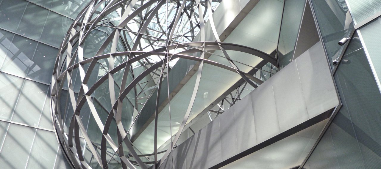 The “Sphere” is a sculpture hanging in the Twin Towers’ entrance hall. It is 16 m in diameter, comprised of numerous individual, flat rings and is penetrated by two bridges connecting the two towers on Levels 02 and 03. The exact geometry and the configuration of the rings were optimized using computer-aided algorithms. B+G was also responsible for the design of the load-bearing glass steps and the bridge walkway.