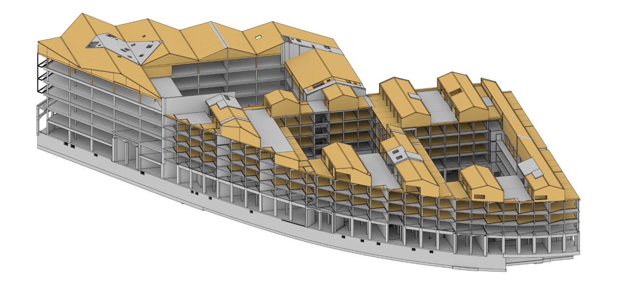Das Gebäude wird in drei Tragwerksbereiche unterteilt. Das Erdgeschoss, das Untergeschoss sowie die Bodenplatte dienen als Sockelbauteil, welches die Lasten aus den Obergeschossen verteilt und in den Baugrund leitet. Für die Obergeschosse von Bauteil 1 ist eine Stahlbeton-Flachdeckenkonstruktion geplant, die auf Rundstützen in einem Grundraster von 8,1 m × 8,1 m auflagert sind. Für die Obergeschosse der Bauteile 2–5 sieht das Tragwerkskonzept ein filigranes Stahlbetonskelett vor, welches durch Holz-Decken und massive Stahlbeton-Aussteifungswände ergänzt wird.