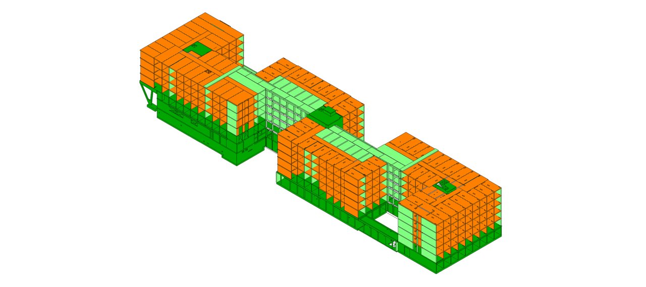 The upper floors are primarily designed using solid timber bulkhead construction. The cross-laminated timber ceilings function as single-span beams and are separated by a joint at the flat partition wall for sound insulation. The flat partition walls are designed as load-bearing solid timber wall bulkheads. The ceilings of the communal areas, along with the shear walls, are constructed using precast reinforced concrete. The main challenges from a structural engineering standpoint include the largely beam-free transfer level to minimize clashes with building services (MEP) and integrating in-situ concrete, precast elements, and solid timber construction while adhering to fire protection requirements according to REI90.