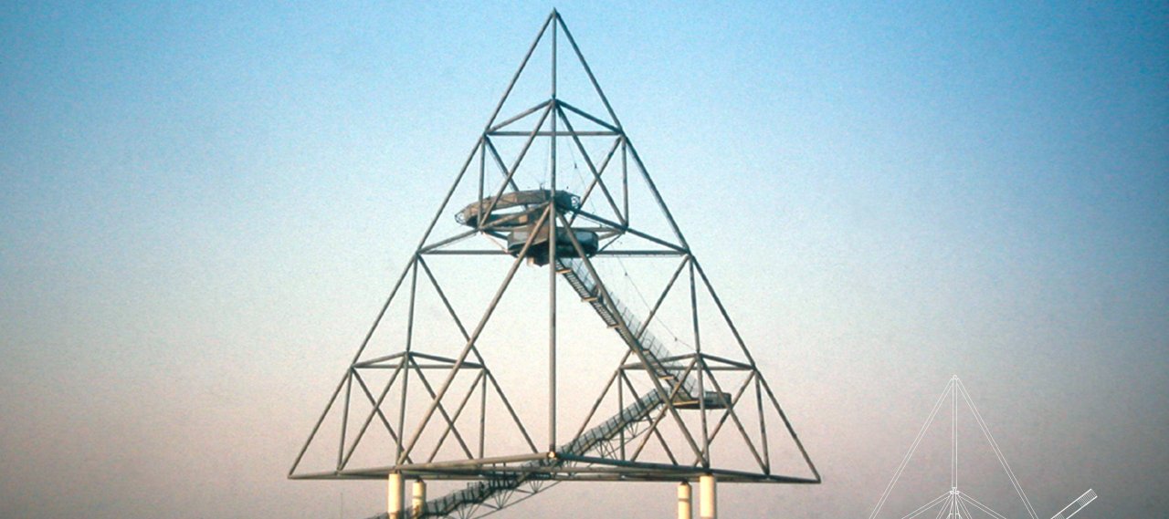 The simple geometrical pattern differentiates step by step, being only experienced as a multiple superimposed space frame at the bottom, with the function to provide the fixtures for the stairs, pedestals and orientation platforms. The stairs and platforms are suspended on three axis by steel cables and are constructed as cantilevered structures which diversely swing when walked on.