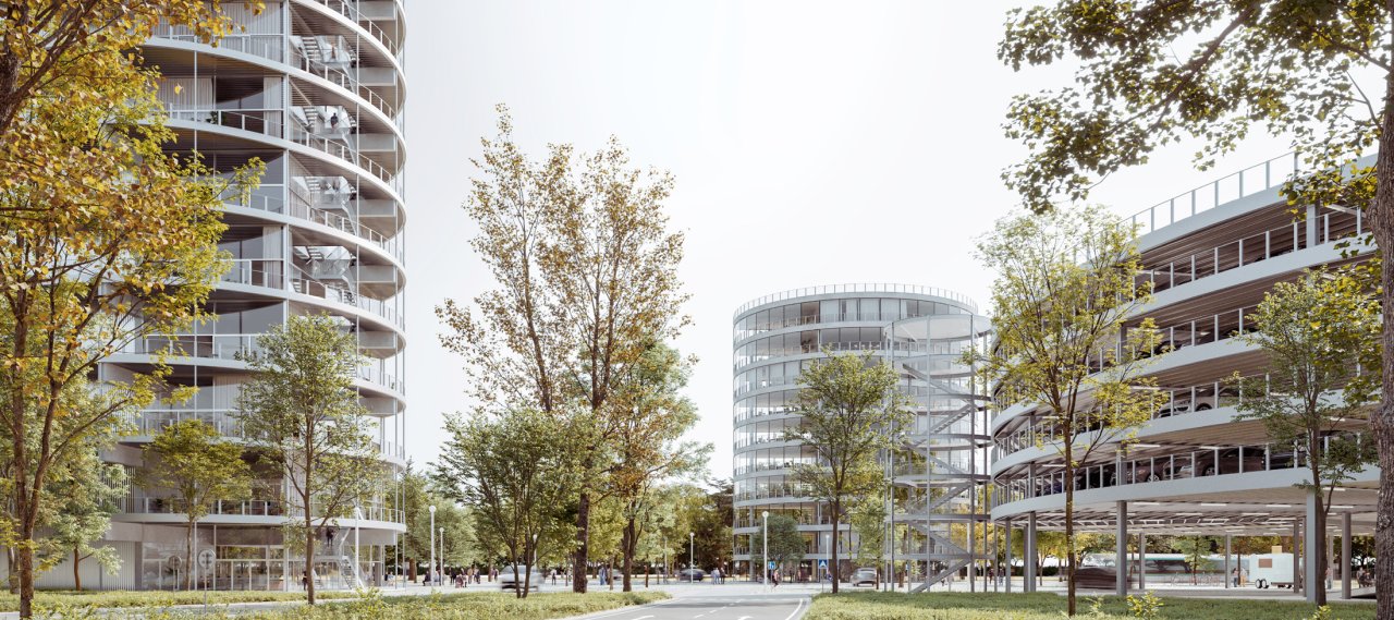 The structural concept involves flat slabs supported by columns, featuring a minimalist design and large, open areas for flexible use. The cylindrical geometry of the buildings informs the load-bearing strategy, while floor layouts remain adaptable for future changes. Material choices prioritise efficiency and performance, and BIM coordination ensures precision in the execution and integration of technical systems.