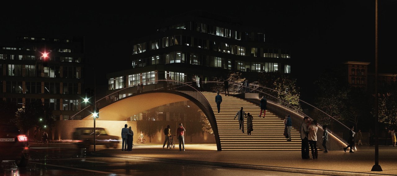 Het ontwerp van de nieuwe brug op het Oskar Kalbfell-plein is een iconische maar eenvoudige constructie, waarvan de vorm perfect is aangepast aan de omgeving en de functionele vereisten. De nieuwe stalen brug is zowel in het zicht als in het plan gebogen. Hij vormt een zeer elegante dubbelgekromde structuur met vlakke treden.