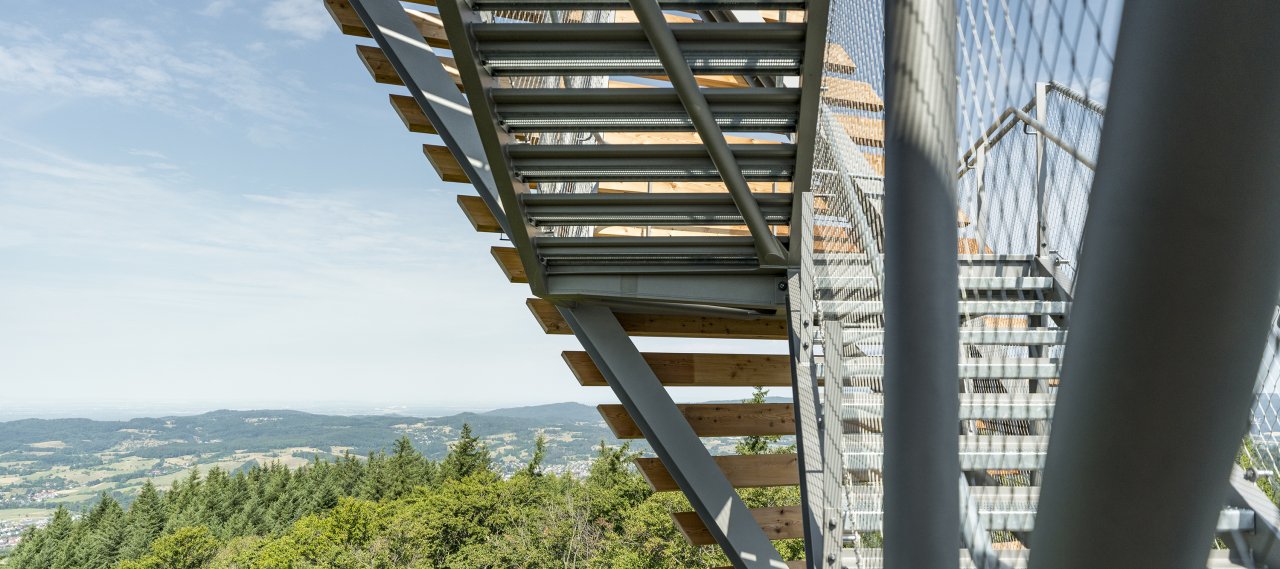 Het ontwerpbepalende concept van de "sky ladder" bestaat uit een 54,3° hellend ruimtelijk stalen raamwerk, dat samen met de in de diepte verspringende trappen wordt gevormd. 192 treden leiden de bezoekers via afwisselende klimrichtingen kronkelig naar het bijna 20 m² grote platform, dat 34,80 m boven de grond zweeft.