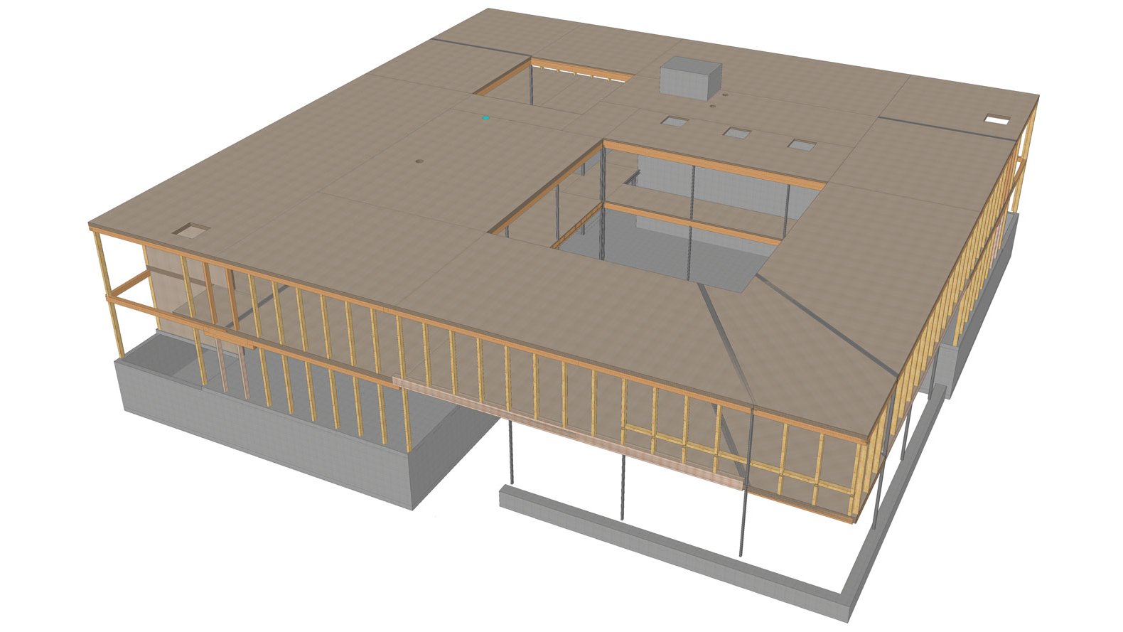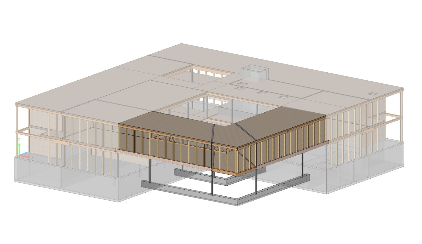 Het gebouw werd opgetrokken in een massief houten constructie. Het heeft een vierkante plattegrond en is gerangschikt rond twee binnenplaatsen. De kelder, trappenhuizen en schoorkernen zijn uitgevoerd in betonconstructie. Het platte dak overspant zich langs de lengteas van het gebouw en is dragend verbonden met de dwarswanden; de dakbekisting rust op regelmatige afstanden langs de lengteas op stalen liggers.
