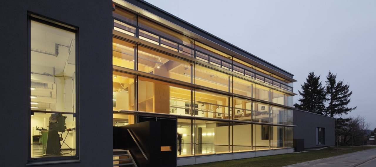 The highlight of the reconversion was the creation of a spacious entrance lobby which cantilevers over two storeys and is enclosed by a slender glass façade. A part of the columns for the load-bearing construction of the new entrance roof was built in a shelf-type structure. Therefore it can also be used to serve as an exhibition space or for meetings.