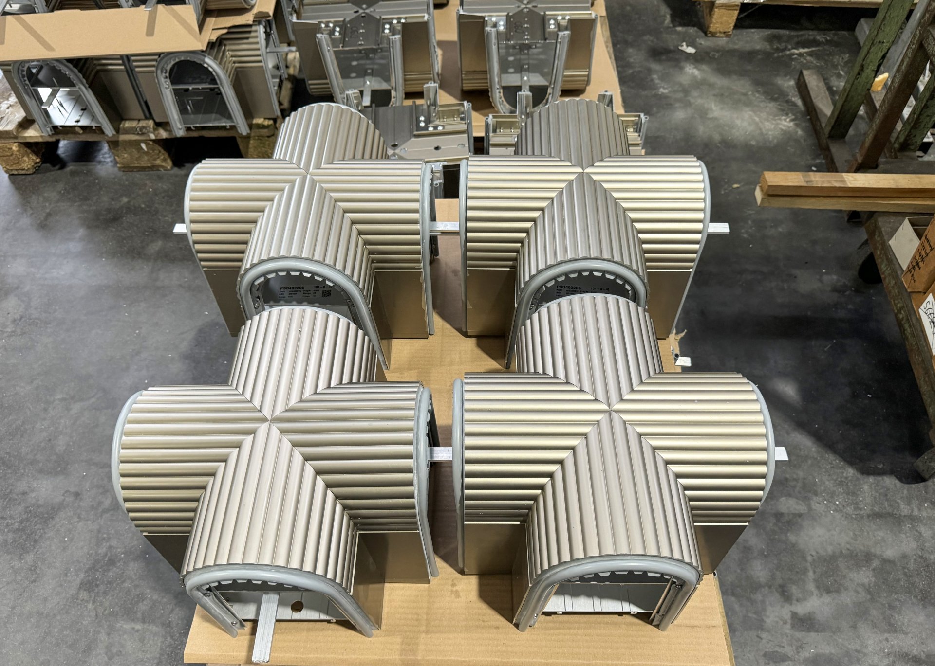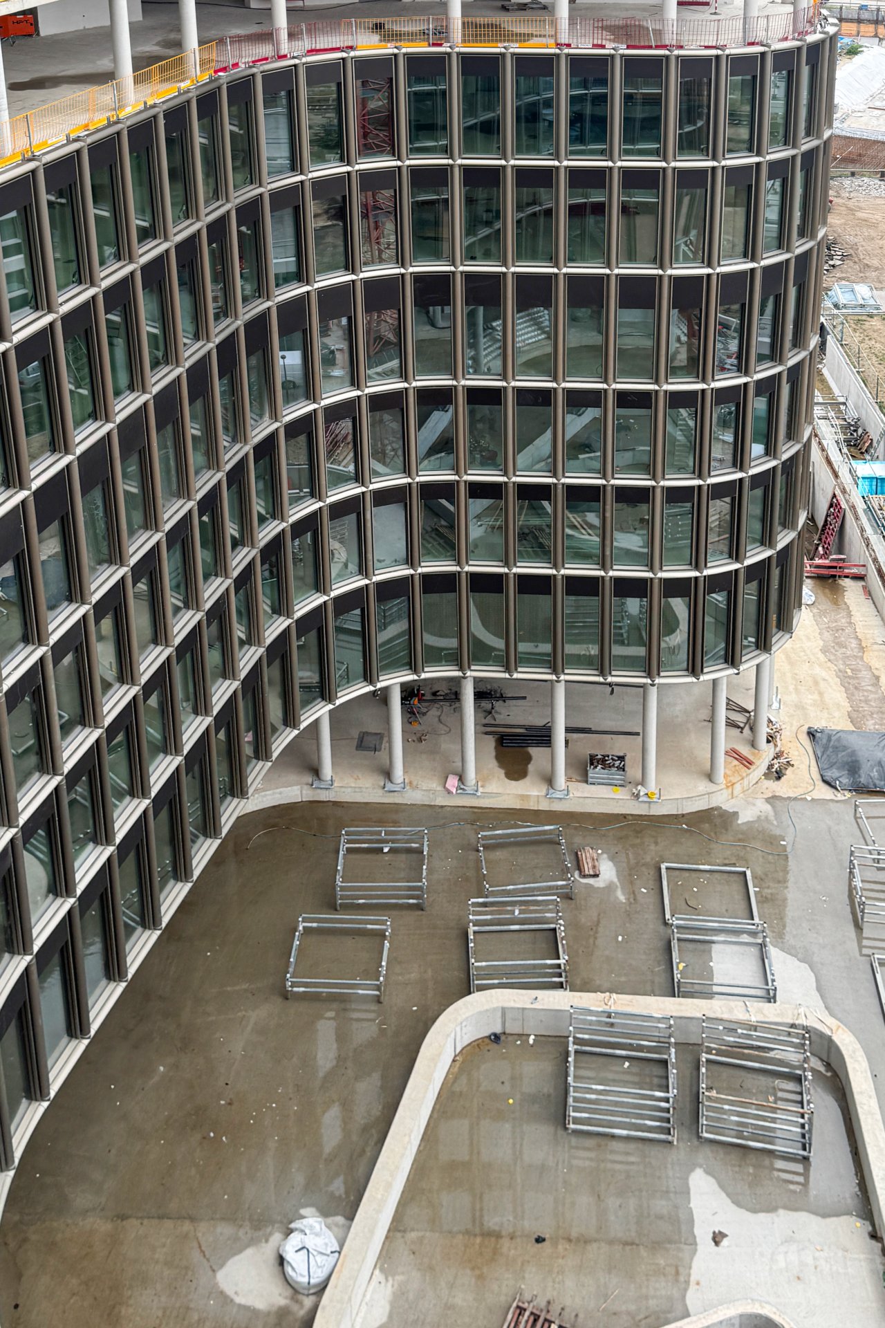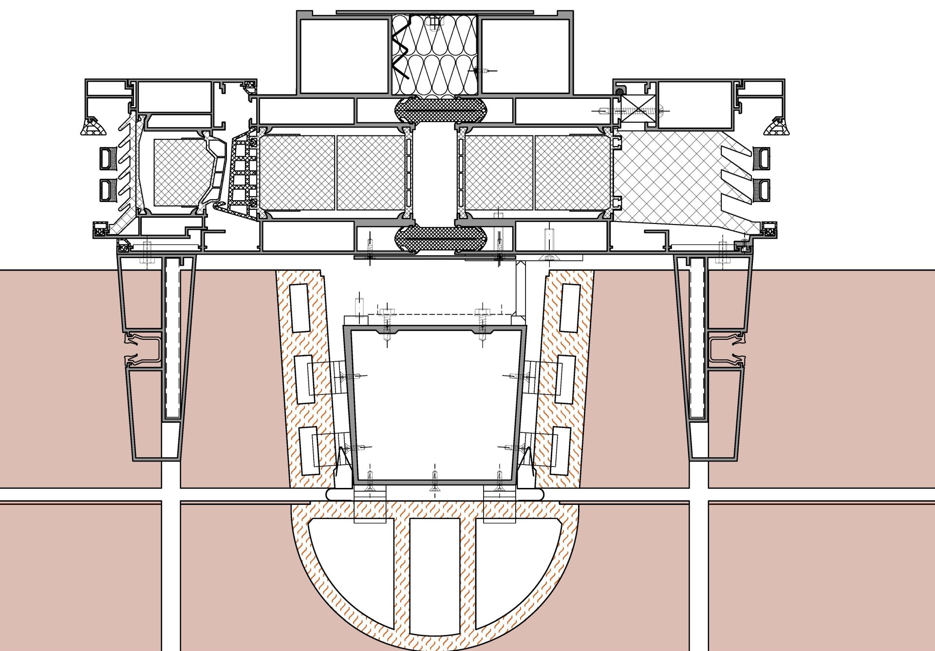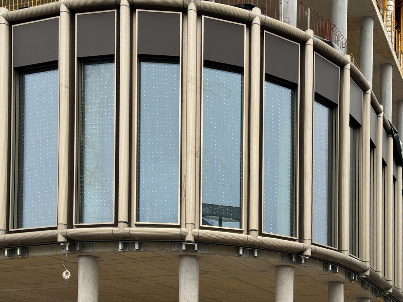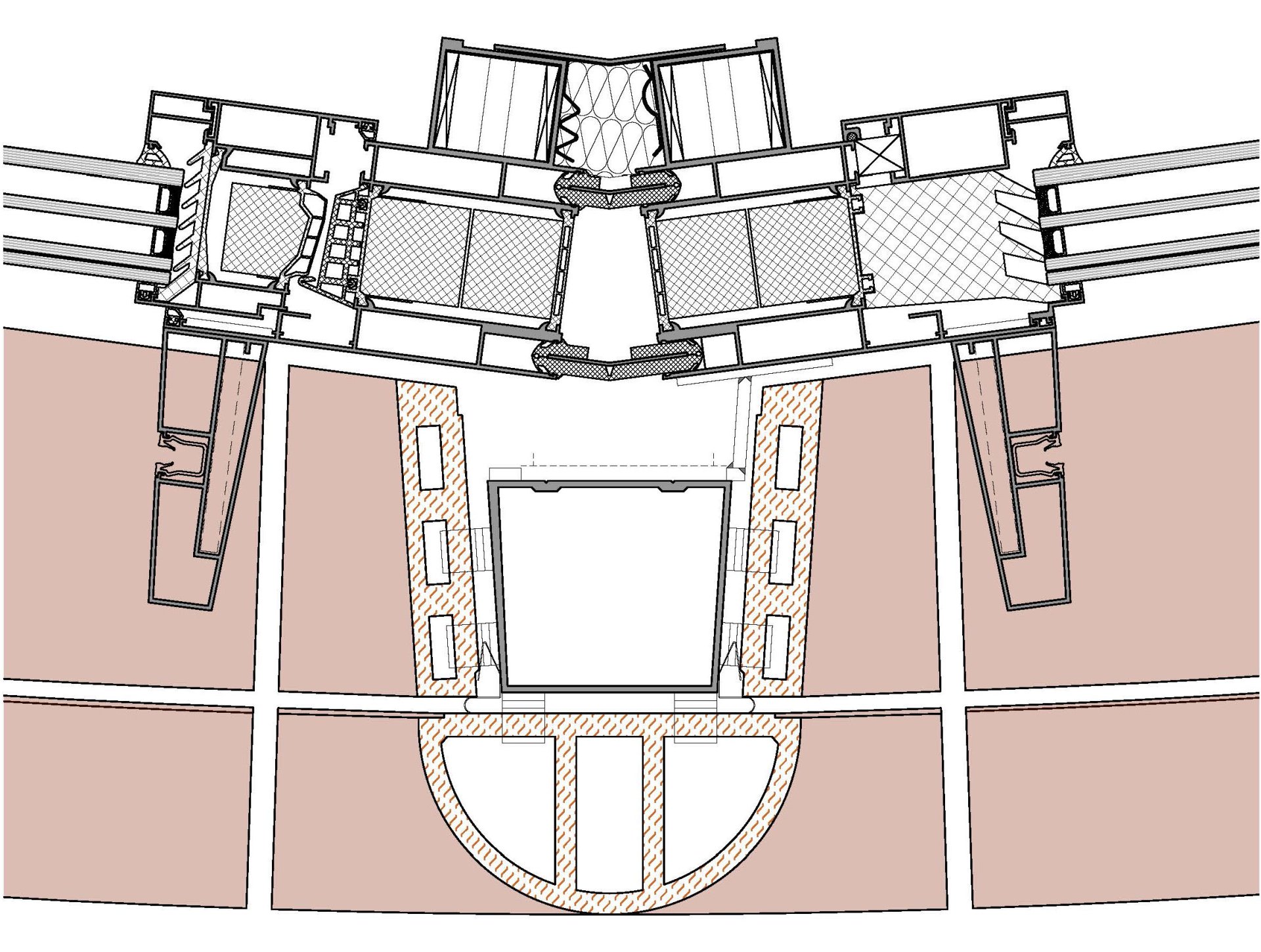 The building envelope runs homogeneously around the entire structure on the upper floors with a slim façade grid of 1.35 m and 1.50 m. The standard façade is designed as an element façade, made of thermally separated aluminium profiles with floor-to-ceiling triple-insulated glazing for fall protection. Fixed panels alternate with pivoting panels. Due to the narrow façade grid, the polygonal façade on the upper floors follows the building's rounded edges. Vertical and horizontal three-dimensional aluminium pilaster strips are used along axes of the façade. The design elements of the upper-floor façades are incorporated into the base façade through a double grid. The large-format insulated glazing is curved convexly or concavely along the contours of the building.