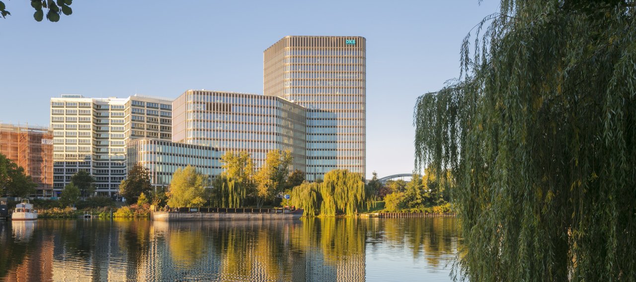 The office building, located directly on the waterfront in Berlin, consists of a multi-level building complex comprising three structures arranged in a star shape. By far the largest part of the building is used as office space. The lobby is a double-storey space with a gallery and provides direct access to offices, conference rooms, lounge areas and a canteen. The top floor houses meeting rooms and a sky bar.